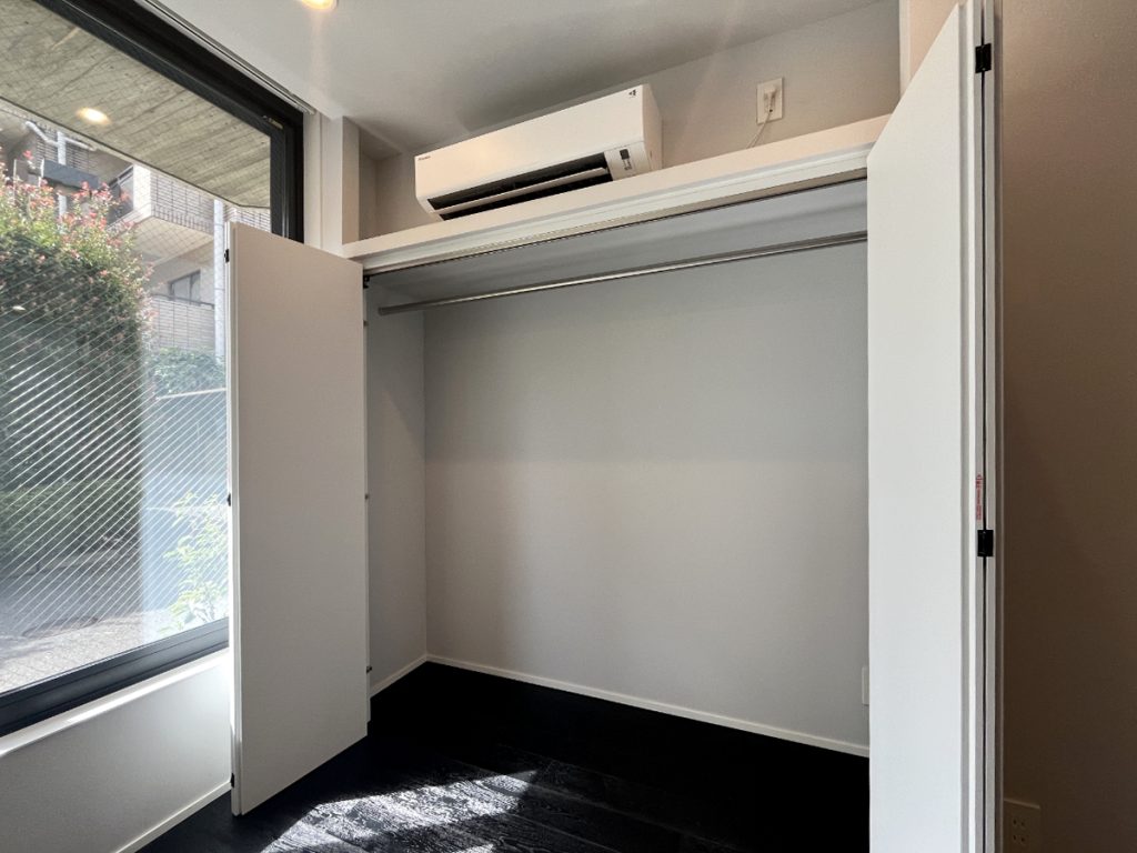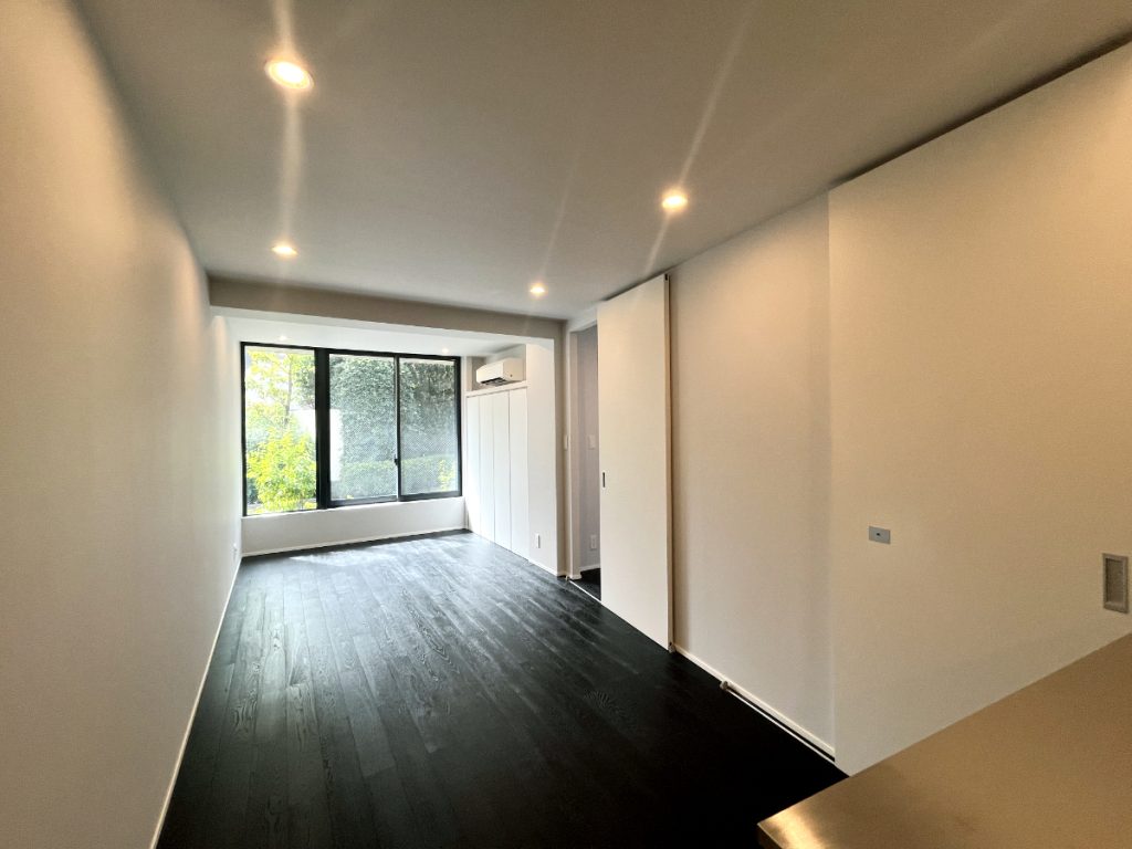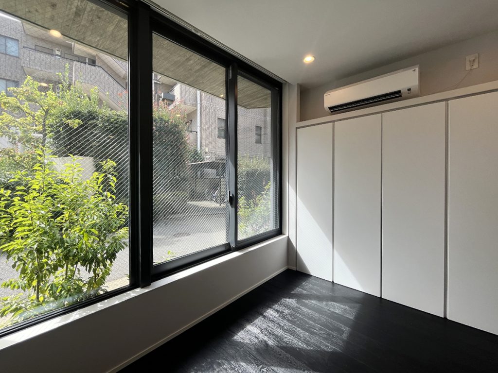 窓が印象深い1LDKの一室。室内に入り、真っ先に窓辺に近づいてみました。植物の緑を映し、温かな日差しを迎えるこの窓は、絵になるような見事な景色です。1階なので普段カーテンを開けることは少ないと思いますが、人通りはそこまで多くないので、開けて緑の景色を取り込む時間も持てそう。窓辺にソファやチェアを置いて座ったら心地よさそうでした。