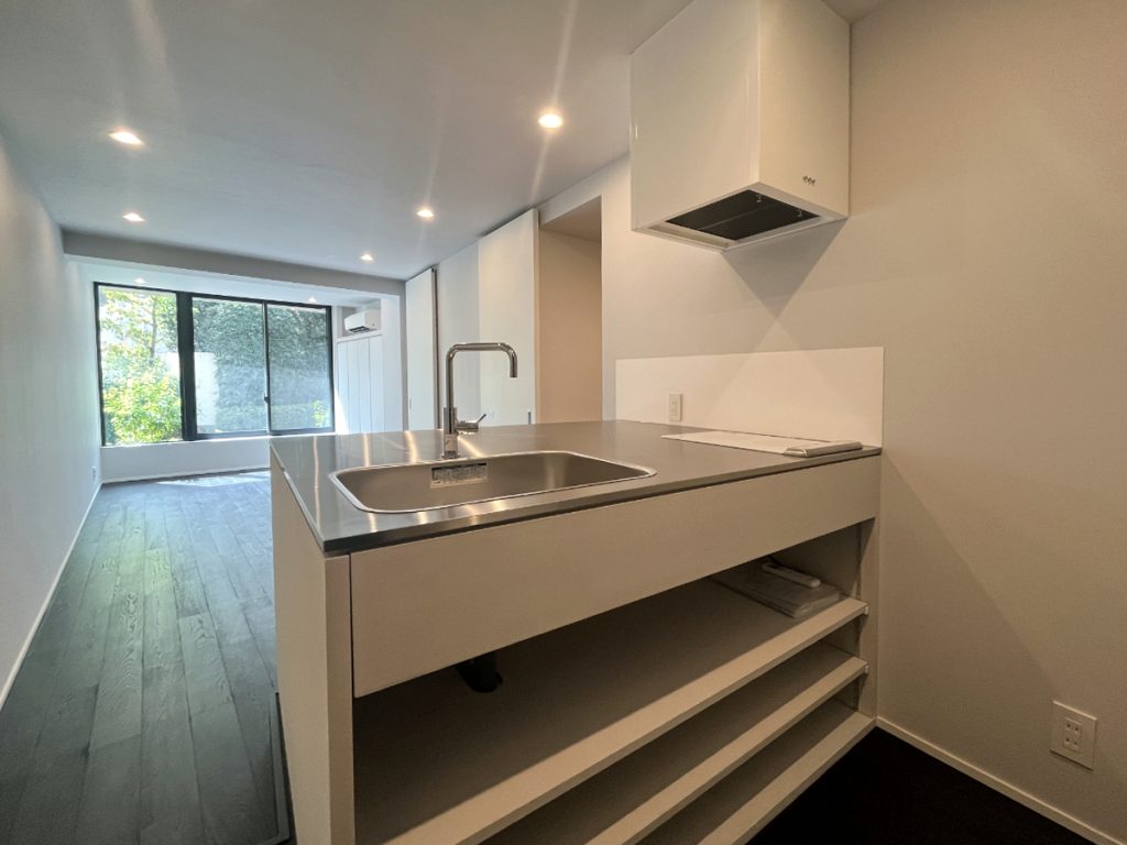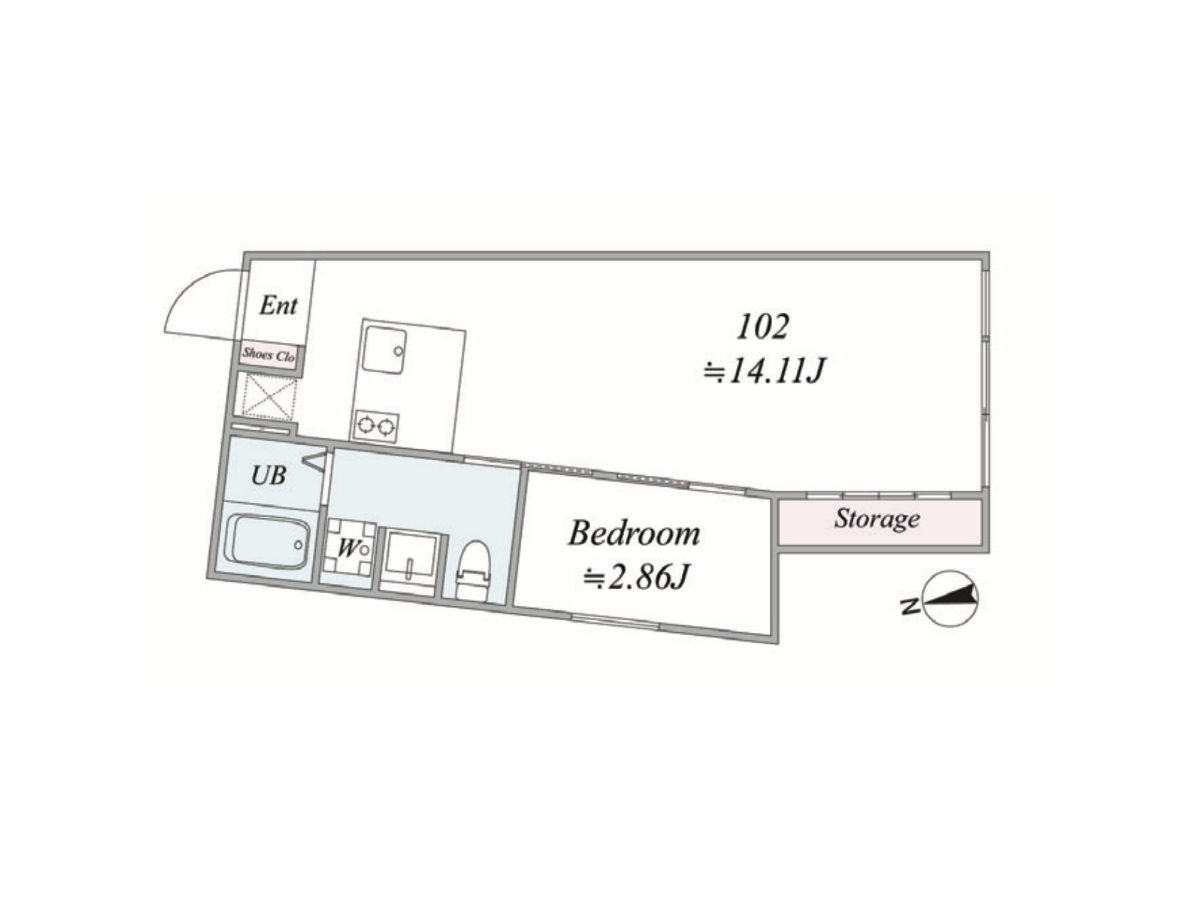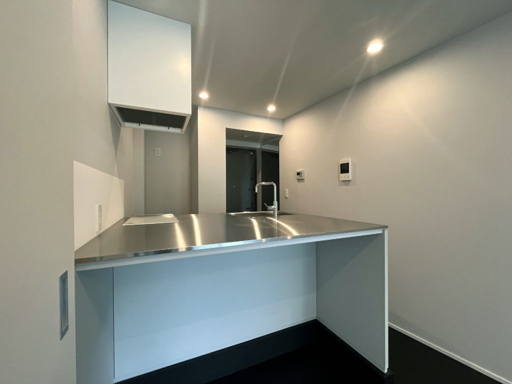 部屋は濃い色の床に白い天井・壁のコントラストに、ステンレスのキッチンが調和したLDKがメイン。キッチンはカウンターにもなっていて、朝やブレイクタイムにサッと休める場所になります。玄関からすぐ居室・キッチンがはじまるのでワンルームのようなつくりですが、広さが充分あり、寝室スペースとなる約2.86帖もメリハリある生活が築ける一室になります。ちょっと贅沢に、自由度高い一人暮らしが思い描きやすいお部屋です。