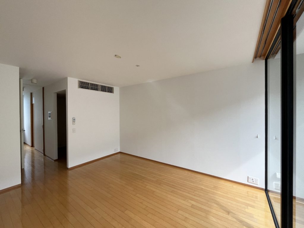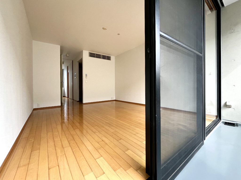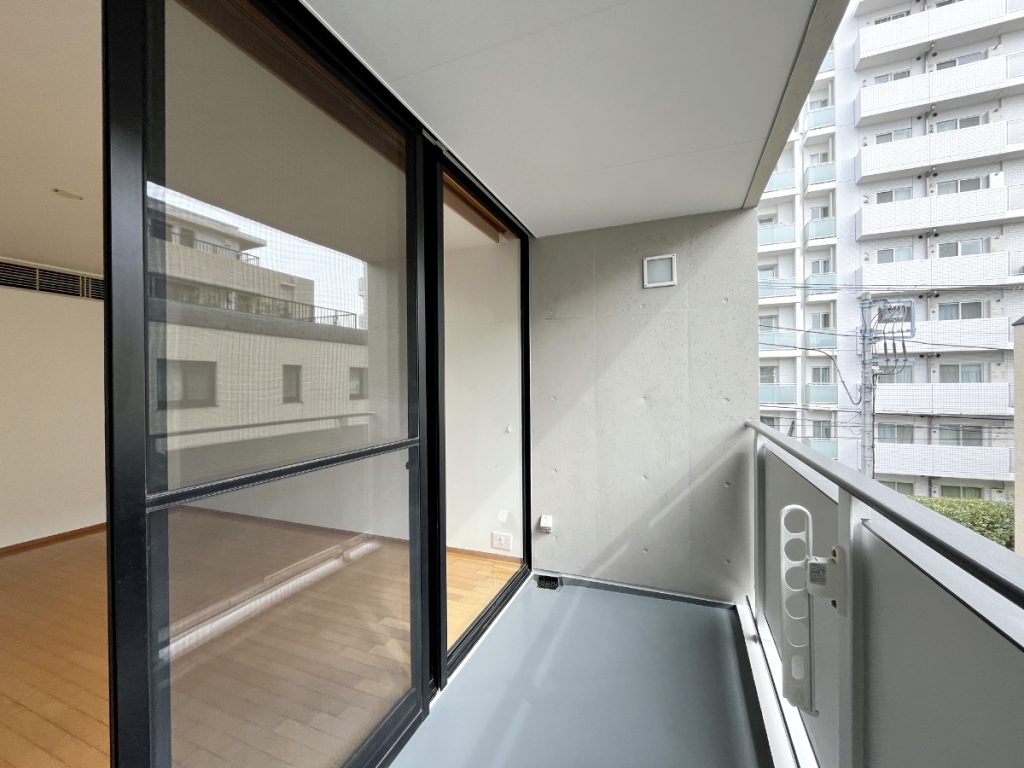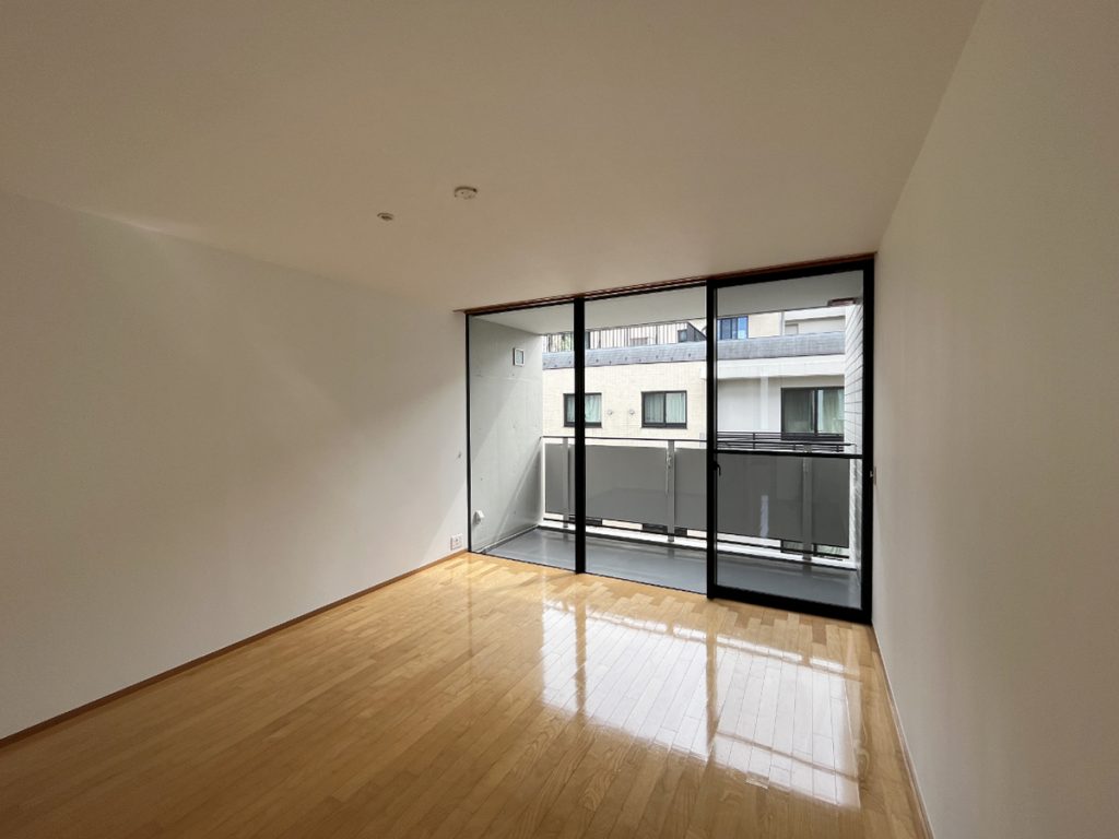 そして一面に広がったガラスの窓。大胆に開かれ、すっと心身に空気が渡るような開放感が、ここでの居心地よさに直結しています。窓の外はバルコニー。南向きで日差し・風当たりともによく洗濯物には困りません。一面ずらりと窓はあるものの、部屋自体はレイアウトしやすい四角い居室なのでお好みの一部屋に。左右反転させたり家具を変化させてみたり、模様替えも意外と気軽に楽しめる一室となっています。