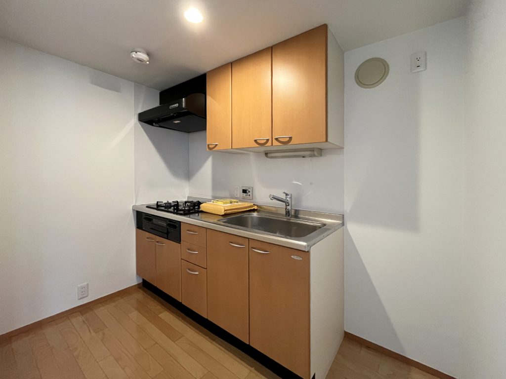 ゆったりとした広さに、3口ガスコンロ、収納の多さが好印象のキッチン。