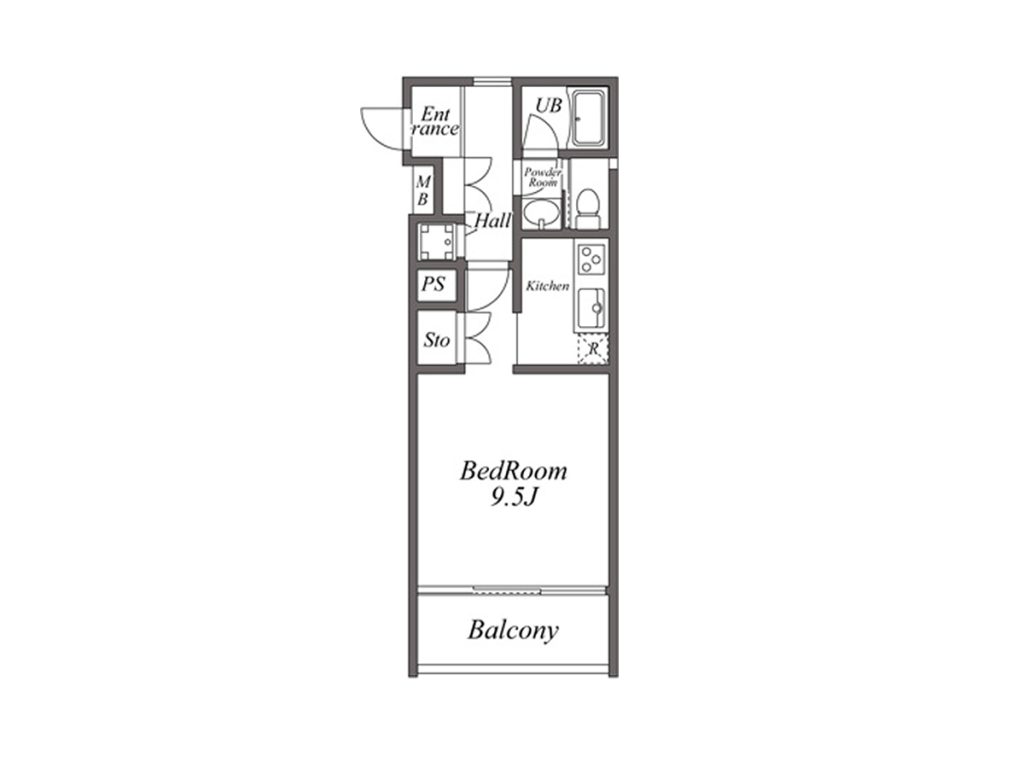 間取りは玄関先に水まわり、9.5帖の洋室からなるつくり。半個室のようなキッチンまでが居室の空間で、浴室や洗濯機などの水まわりからは扉で仕切られた、ちょっと変わったつくりの1Kです。一見するとあまり存在感のないキッチンなのですが、洋室と流れるようにあり、またしっかりとした自炊向けのキッチン設備を見ると、食事をかたわらに置いた暮らしを送りたい人におすすめなお部屋だと思いました。