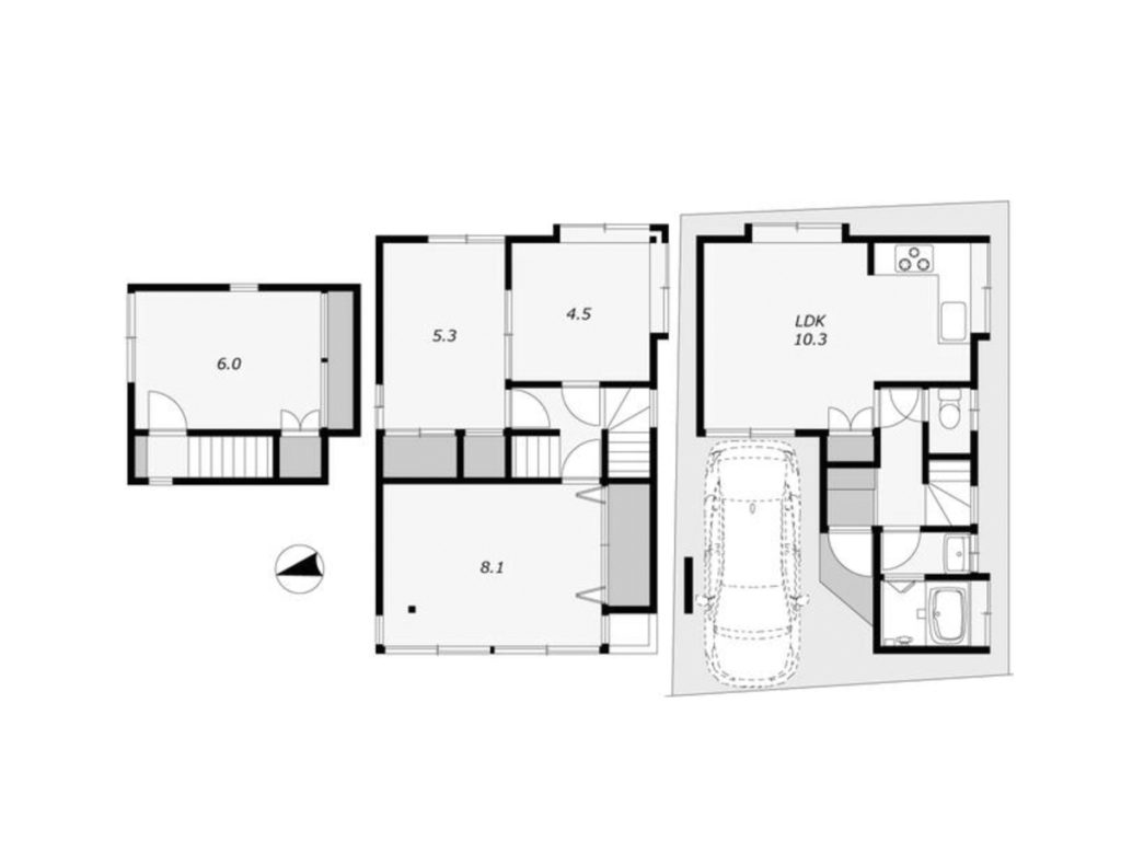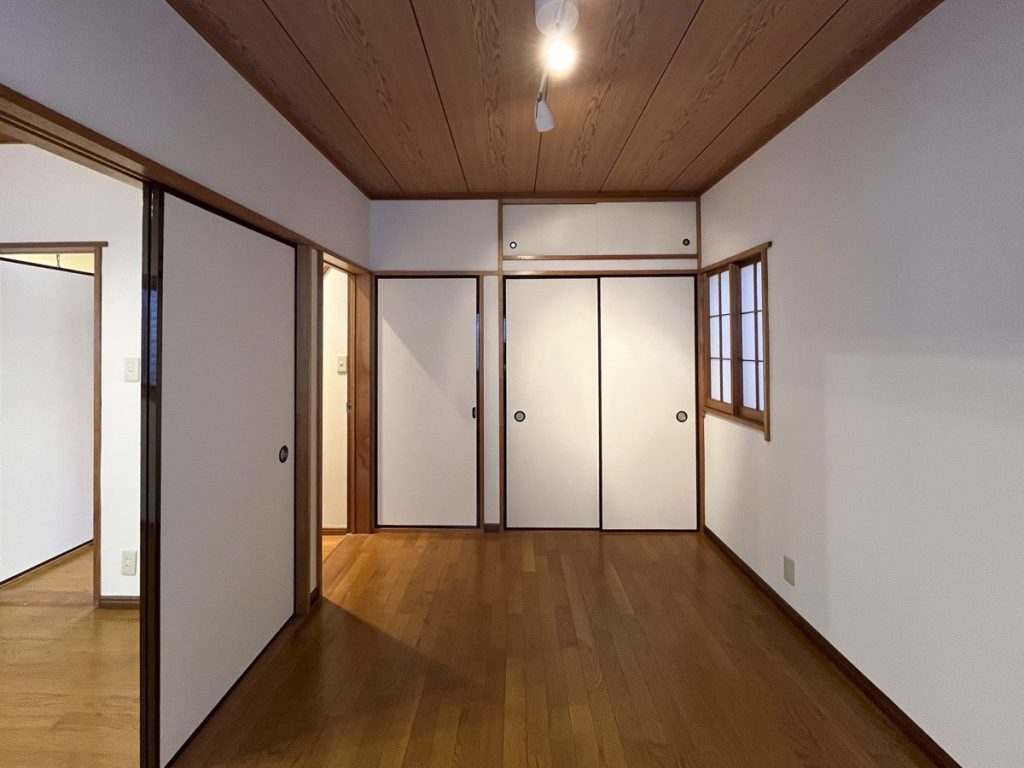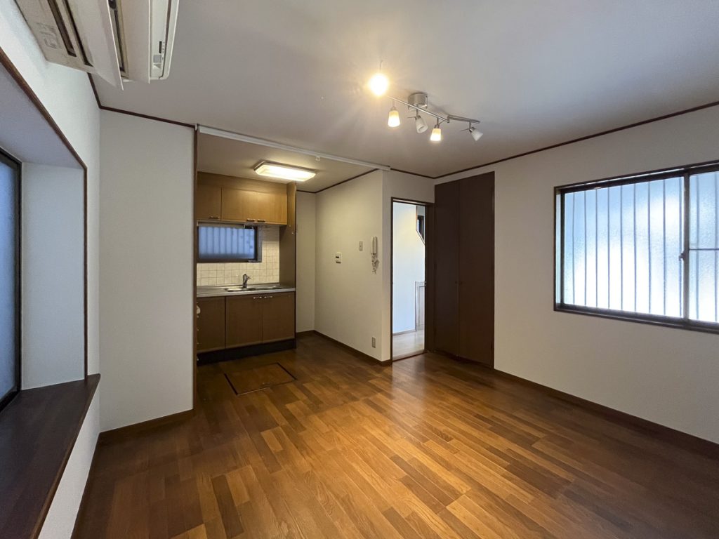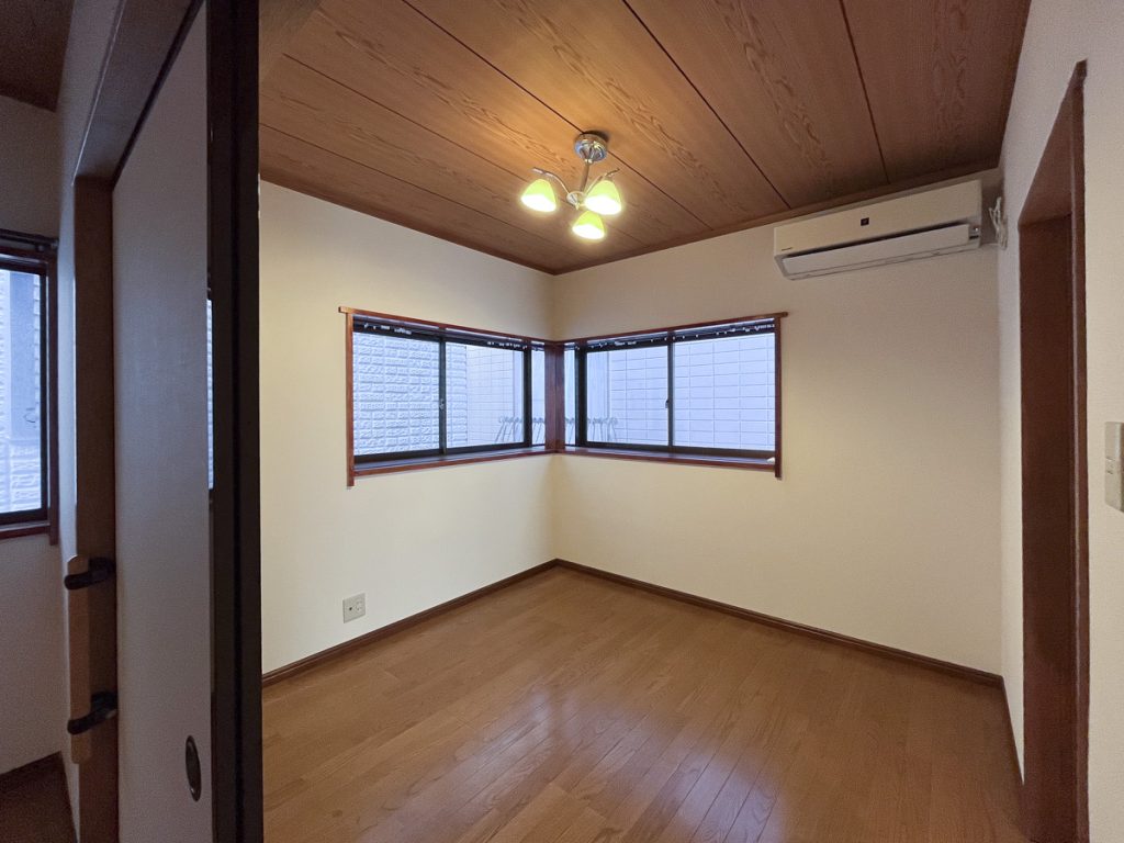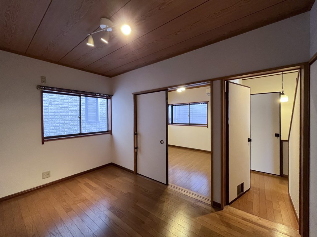 間取りは1階に10.3帖のダイニングキッチン、2階は8.1帖のリビングと4.5帖と5.3帖がふすまで区切られた洋室、そして3階は屋根裏部屋のような勾配天井と天窓がかわいい6帖の洋室という間取りの4LDK。あたたかみのある床材や建具の色合いが、なんとも懐かしい実家感があります。バタバタバタと階段を上り下りする、あわただしい日常の音が今にも聞こえてきそう……「朝ごはんできたわよ!早く起きなさい!」「今夜は部活でおそくなるから!」などなど。1階のお台所が朝は主役、夜は2階のリビングにみんな集まるんだろうなぁ。3方向に建物が隣接していることもあって、2階リビングと3階のお部屋以外はわりと陽当たりはありませんが、お部屋全体に窓がおおくて通気がありました。バルコニーがない分、2階リビングが一面窓になっていて、サンルームのよう。ここでまとめて干しましょう。2階の奥の2室は襖で区切られていて、4.5帖の一室にエアコンが設置されています。なので襖をとってしまって一部屋として使うなんてのもあり。3階は勾配天井に天窓がついていてスペシャルな個室に。全体をとおして収納スペースが多く、成長とともに増え続ける物の収納に困らないんじゃないでしょうか。