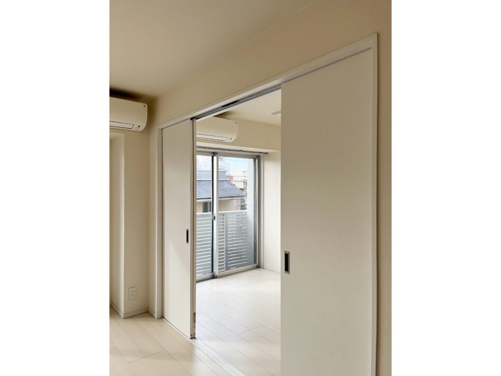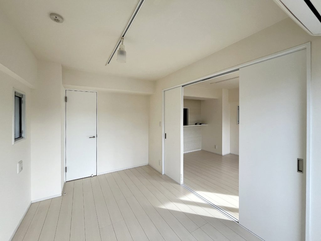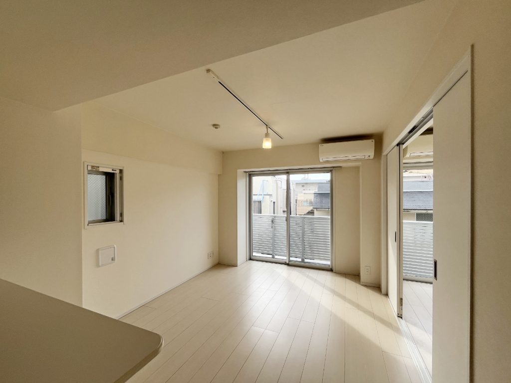 間取りや環境を見ても、想像するような都内での暮らしがありそうなお部屋で、カウンターキッチンから広がるダイニングに、寝室がメインになる洋室は6.1帖とちょうどいいサイズ感。床も壁も白っぽい統一感のある内装で、日差しを取り込むとパッと光に満ちた空間になります。朝がきっと気持ちいい。景色は抜群、というわけではありませんが、風通し良く、窓辺に居たくなります。