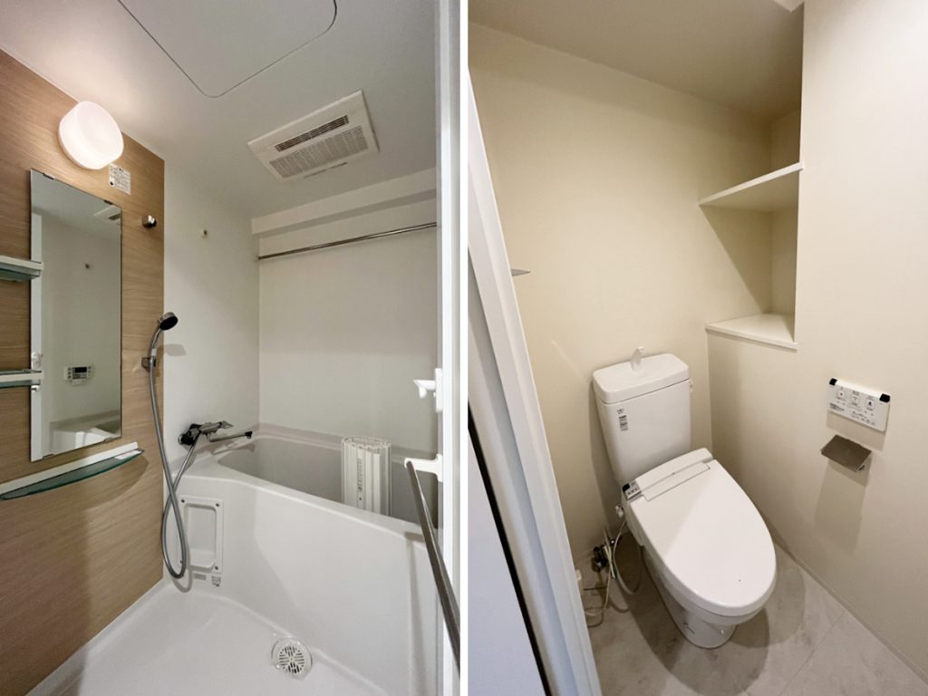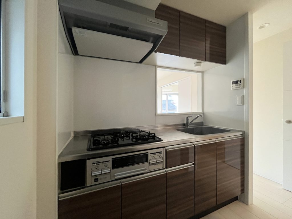 使い勝手やきれいさが気になる水まわりは、申し分なし。とても清潔に整えられています。キッチンは室内から見るとうまく生活感が隠され、3口コンロにグリルもある自炊向けのものです。冷蔵庫や食器棚などキッチン家電がすっぽりと置けるスペースもあります。すっきりとしたキッチンにできますね。