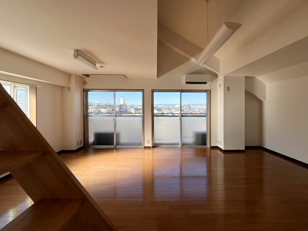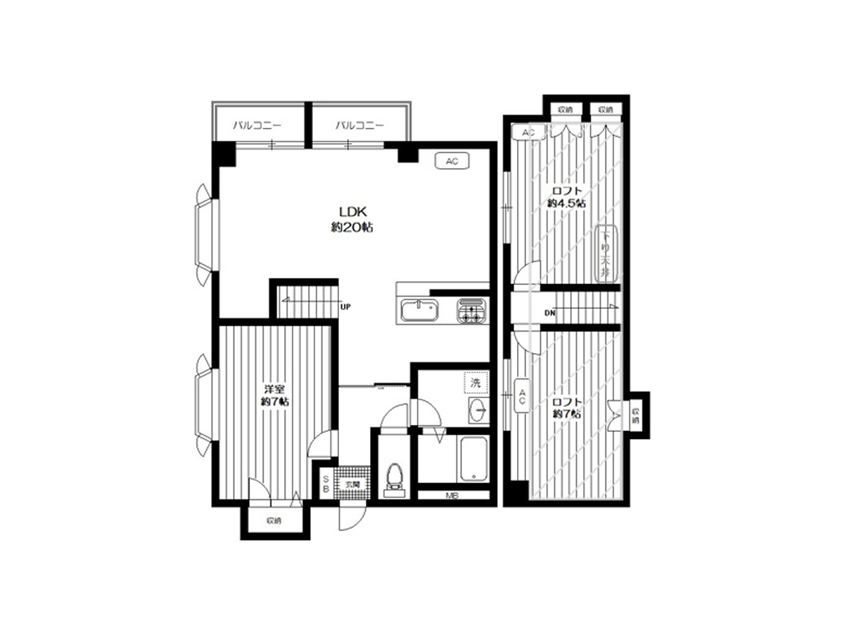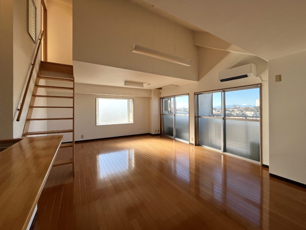 家族で住まえる1LDK……なのですが、約7帖と約4.5帖のふたつのロフトもプラスある間取り。ロフトと言いつつそのつくりから、ひとつのお部屋と言ってもいいようなもので、家族や数人で伸びやかに過ごせる一室です。
