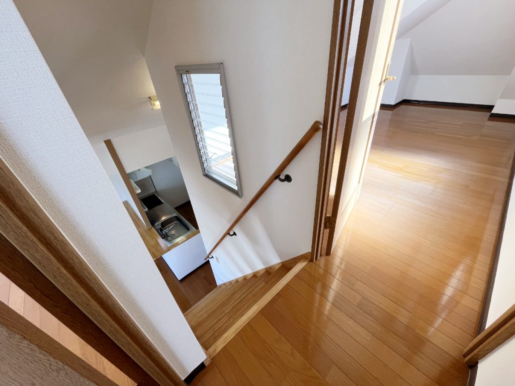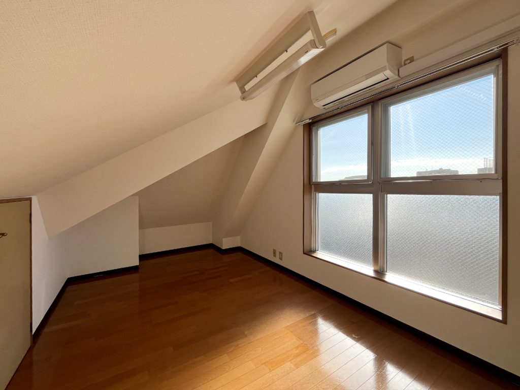 階段を上がった部屋が、ふたつのロフト。天井が斜めになっていて、頭上にはちょっと注意ですが、広さに収納、日差しのたっぷり入る良い部屋たちで、子供部屋や仕事部屋にぴったり。