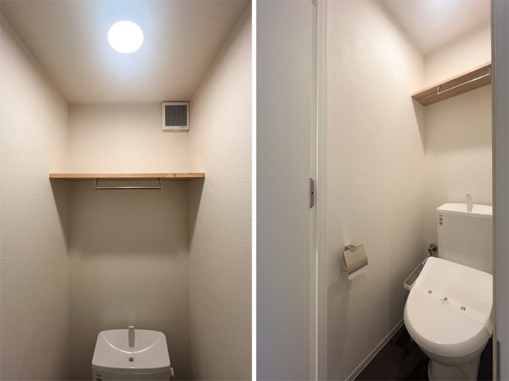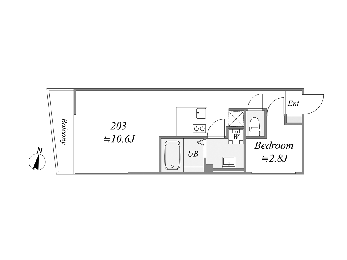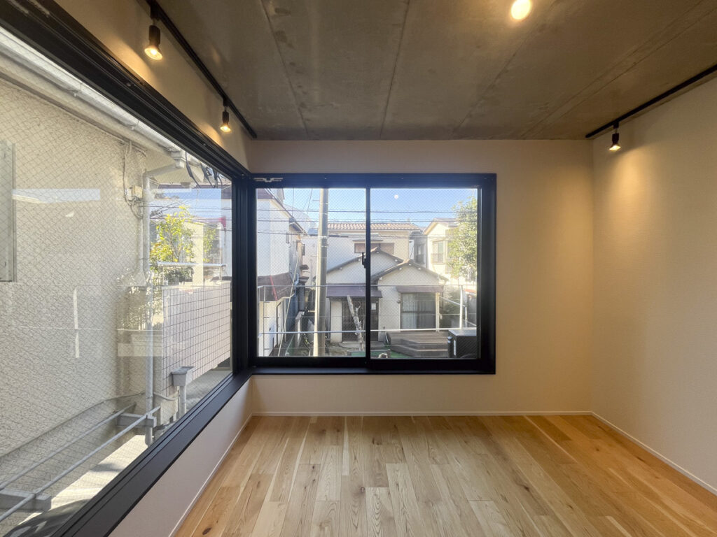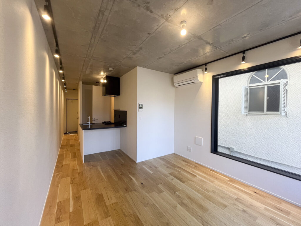 メインのLDKはコンパクトですが、角窓がたっぷりの開放感を運んでくれるので、思ったよりものびのびとした印象。2.8帖を寝室にするなら窓辺に小さなソファを置いてまどろみの場所に。ベッドをLDKに置くことにしたら、寝具も合わせて好みで揃えたワンルーム的に。天井はRC打ちっぱなし、床は木のフローリングと素材感のある内装なので、合わせるならビンテージものやファブリックなアイテムも良さそう。