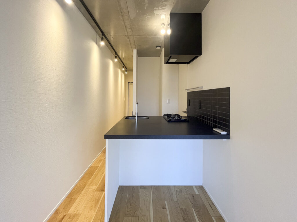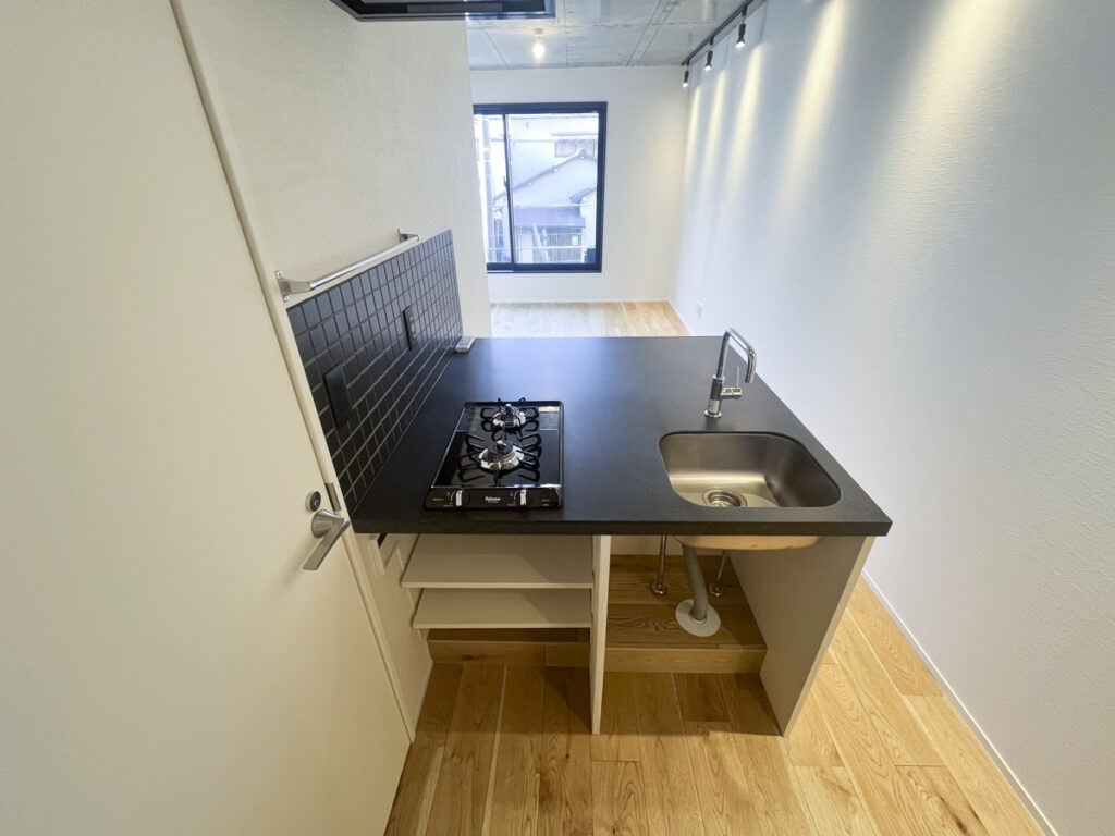 キッチンモノクロカラー。収納は下部分にオープンなものが。