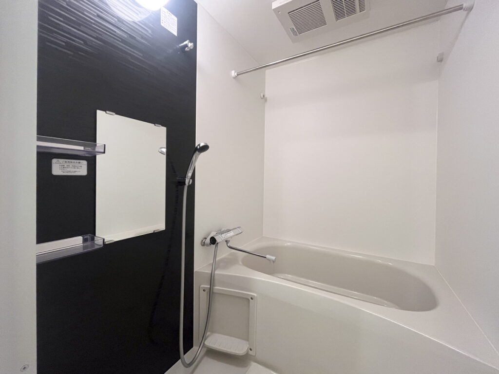 シンプルな浴室。乾燥機付きで雨の日の洗濯物にも。