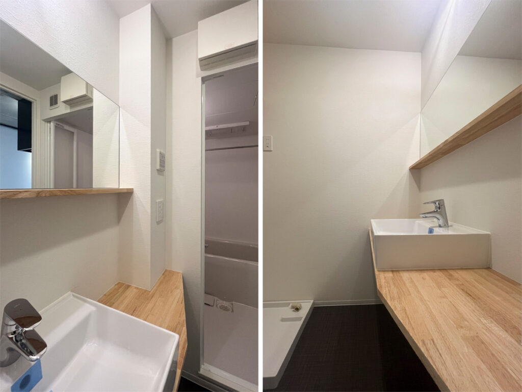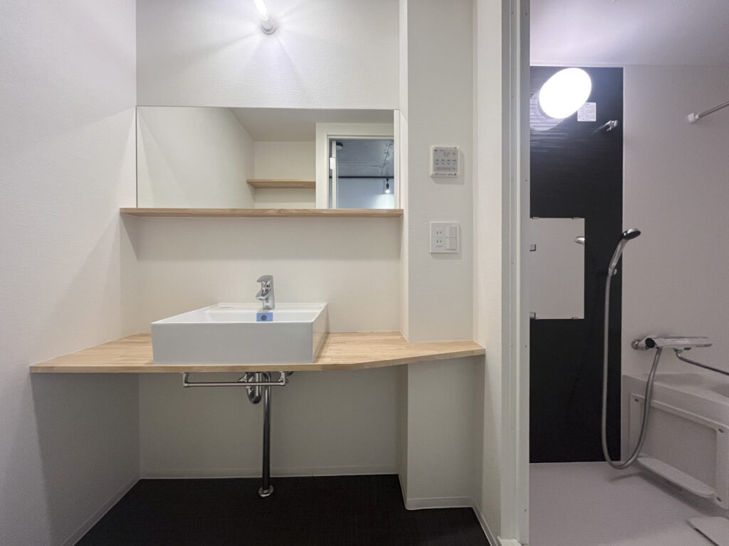 キッチンはキュッと絞まったダークカラーなつくり。こちらもかなりコンパクトで、自炊を捗りたいならカウンター部分を調味料置きや作業に使うとぐっと勝手が良くなると思います。