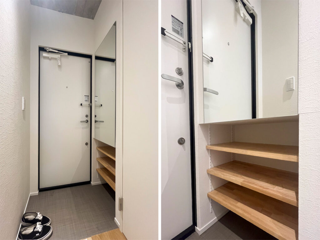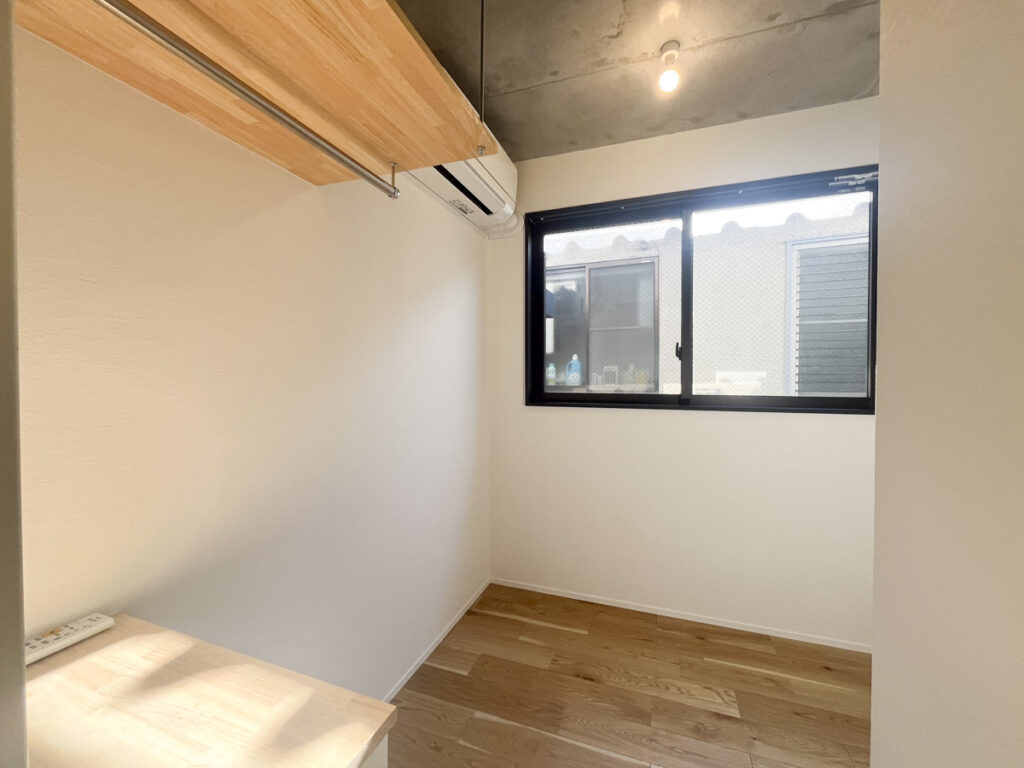間取りは、玄関から左手に2.8帖が一部屋、キッチンを抜けた先にリビングがあるシンプルな1LDKのつくりをしています。2.8帖は寝室ならベッドがぴったりギュウギュウ。エアコンも窓もあるのでせっかくなら、家での仕事や趣味で集中する時間をつくりたい人の一部屋とするのが、2.8帖の使い方としてはおすすめ。荷物やお洋服が多いなら、まるっと収納にしてしまうのも手かも。