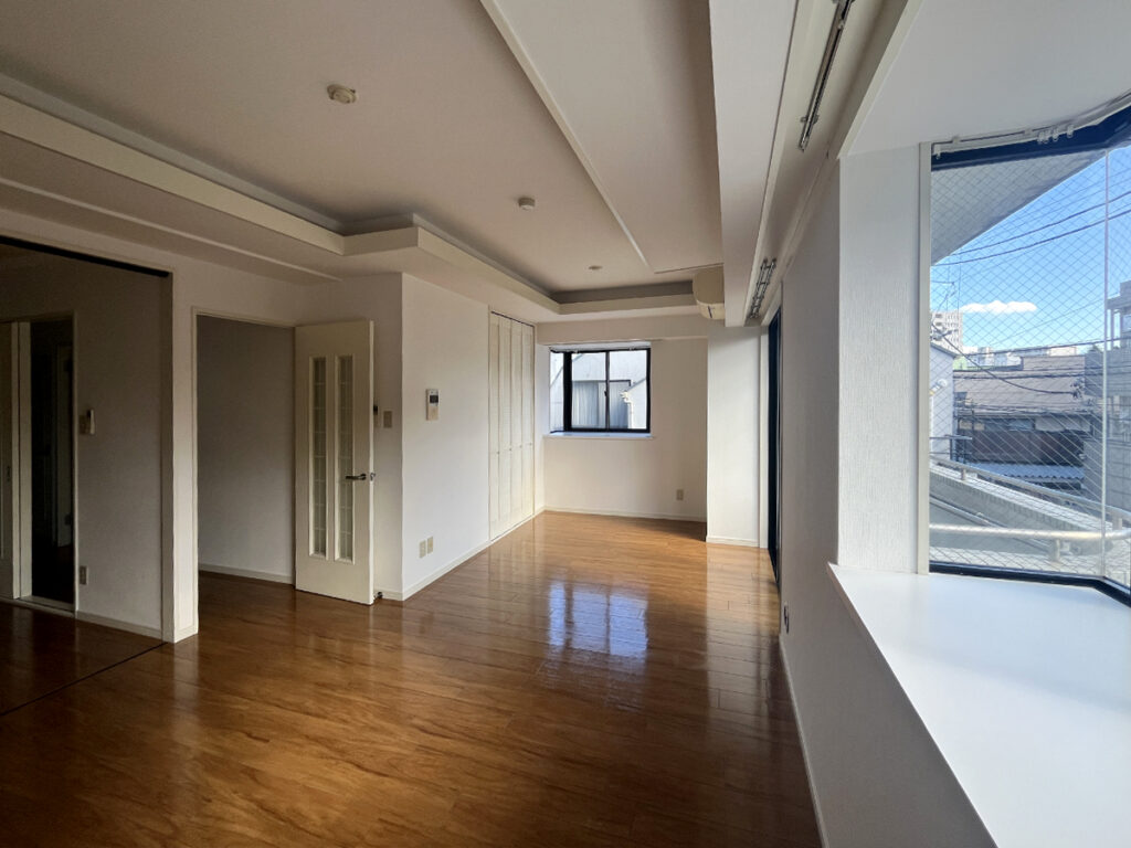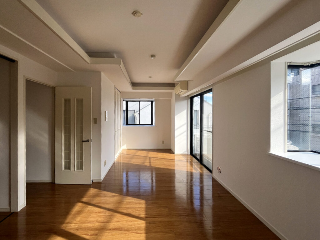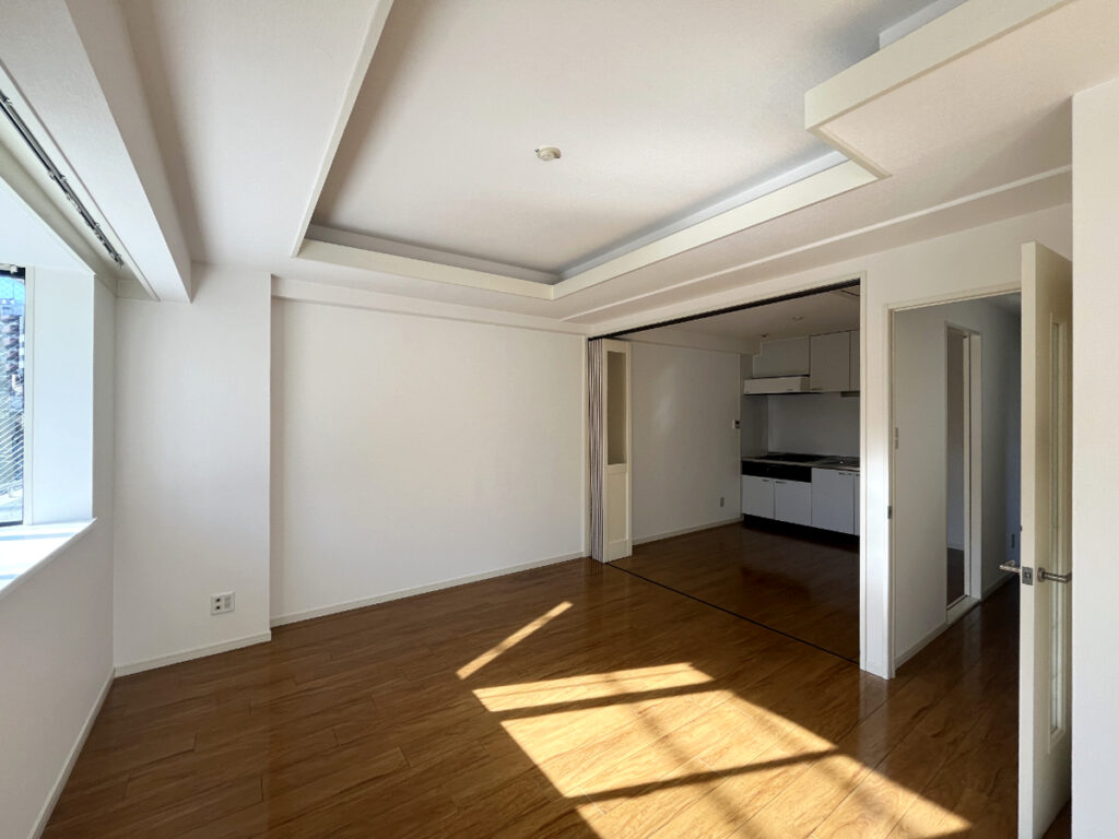 キッチンから居室までL字の形にになった、18.5帖の贅沢なLDK。その天井には間接照明があり、部屋の印象を上品にしてくれています。出窓とバルコニーへの3個の窓からは、南東の日差しがパキッと入り。間接照明とはまた違った温かみのあるこの明かりも、また見事。大きなテーブルを置いた大胆なレイアウトや、ソファやキャビネット、ラックを置いて仕切りのある空間も自由にできるLDKです。