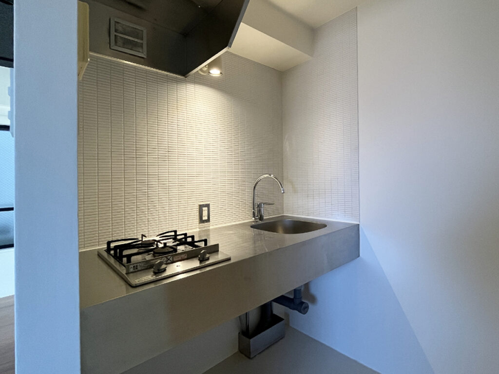 リノベーションというだけあって、よく見ると所々にラフな古い要素もあるのですが、そこにちょっぴり工業的な部分が合わさり、これがまたいいかけ算になっています。剥き出しの配管や、オールステンレスのキッチンもそう。力のあるスタイリッシュな見た目は、部屋の一色として遜色ないほどです。